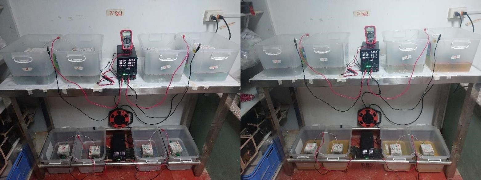 The experiment is conducted based on the impressed current method which uses an external DC power source to induce and accelerate the corrosion process. In this setup, the concrete specimens with embedded rebar act as the anode, and a sacrificial metal (such as copper) will serve as the cathode. The specimens are submerged in a saline solution to simulate coastal conditions.